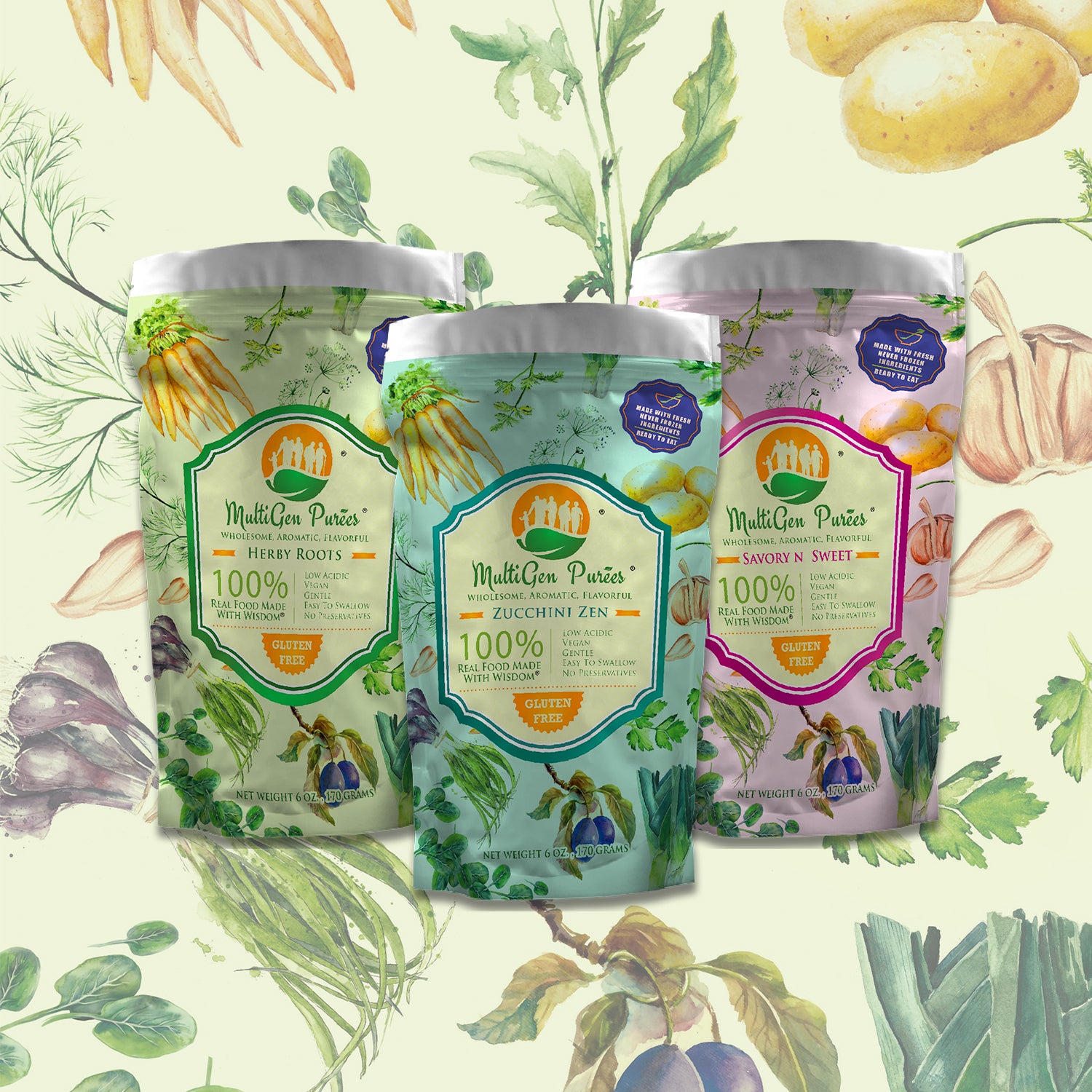 100% real food made with wisdom means exactly that – fresh AND raw ingredients from start to finish. The MultiGen Puree food ingredients are grown by local farmers in the area that avoid the use of harmful and unnecessary preservatives on their plants. The special blends are derived entirely of nature-made ingredients that are gluten-free and vegan. Once harvested, the food is hand-prepped, cooked, pureed and packaged without adding any new additions to the already delicious and natural pureed meal.